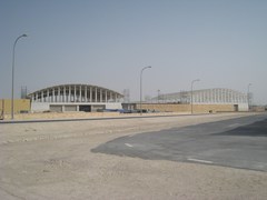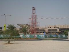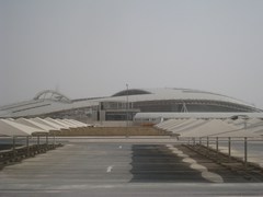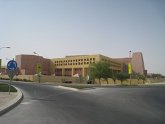 まだ全計画の半分位しかできていないと思われる教育都市ですが、その中でもそうそうに使用が開始されている建物の一つのようで、周辺の職員用の宿舎とともに使われている気配があります(この日は休日だったので、人気はありませんでしたが)。この建物の設計コンセプトや建築の経緯はこちらのサイトに詳しく載っています。こんな中東の果ての名も知れない国に、早々に建物を設計している日本人が居るというのも驚きです。先のサイトに詳しく載っている通り、イスラム特有の要望らしいのですが、ファサードには随分注文があったらしく、中東の50℃になるコンディションやイスラムのアラベスクといった模様などを考慮して、このような二重壁に数学的な幾何学模様に落ち着いたとあります。内側の黄色い色と外の白い壁のコントラクトも含めて、なかなか風景にマッチしているようにも思えます。