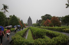 ボルブゥドゥール遺跡は、頂上までの登り降りを含めて2時間位いましたが、とにかく暑くて水は必需品です。 公園内にあるワルンで昼食の後に、もう一つの世界遺産であるブランパナンに向かいました。途中で渋滞とスコールがあり辿り着いたのは3時くらいでしたが、到着早々にまたもや凄いスコールに見舞われました。雨宿りして見学を再開できたのは夕暮れ近くとなってしまいましたが、おかげで夕焼けの空に虹が掛かっている中でのロロ・ジョングラン寺院を見れるという絶景を見ることができました。しかし、ブランパナンも遺跡の周囲は公園となっており、ロロ・ジョングラン寺院の他にも沢山の遺跡群があったのですが、時間切れで結局は他は見れませんでした。非常に残念でしたが、また来る理由が出来たと思って良しとしました。