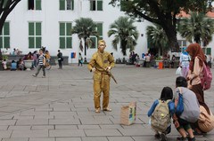 広場は100m四方位の狭すぎもせず大き過ぎもせずという雰囲気で、正面に博物館となっている東インド会社当時の建物があったりと、オランダの統治時代を色濃く残した建物に囲まれています。広場内ではレンタルサイクルやヨーロッパではよく見掛けたパントマイムのパフォーマンスをしている人がいたり、スラバヤから来た大道芸人一家が芸を披露していたりと賑やかな感じで、お茶しながら1日いても飽きない様相でした。