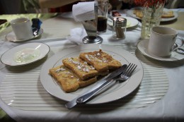 ・定番化した宿のフレンチトーストのブレークファースト。右は満員の待合室ロビー。