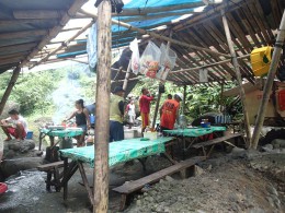 1時間位すすむと小さい滝があり、いわゆる中間ポイントらしい休憩所の小屋が見えてきます。トイレや簡単な飲み物などが売っていて、濡れると思い現金を持ってきていなかったのですが、我々は後払いの宿の付けで買い物できました。そこでは売り子が漕ぎ手のおじさん達にジュースと焼き鳥を御馳走してあげて良いかと聞いてくるのですが、彼らの働き振り(疲労振り?)を見ていた我々は断る理由もないので、一人200PHP程度の焼き鳥とジュースを奢ってあげます。もうこれは仕方ありません。