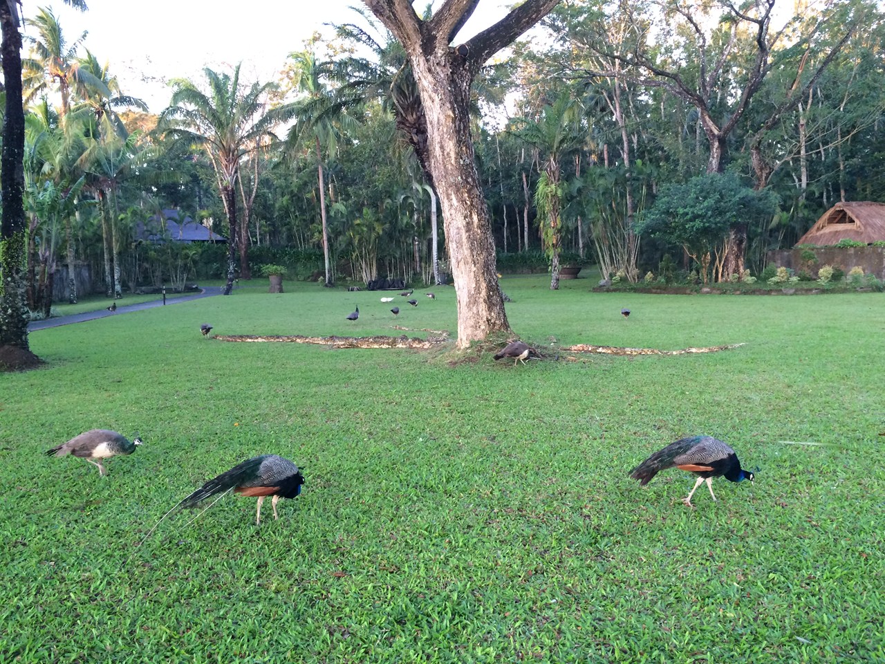 構内は想像より相当広くて、レセプションからビラのあった北側エリアまでは徒歩で10分位掛かる感じです。途中の池には何故か孔雀の群れが放し飼いになっていて、後でこれらの群れが我々のビラに押しかけてきて大変なことになりました。敷地内もビラも前評判以上に本当に綺麗で居心地の良い場所です。ウブドなどでもそうだったのですが、高級リゾートでも宿はなんとなく湿気っている感じのところもあったのですが、ここのビラは木板で綺麗で何より照明が明るくて本当に落ち着きます。やはり欧米人オーナーということもあって、維持管理が違うのでしょうか。
