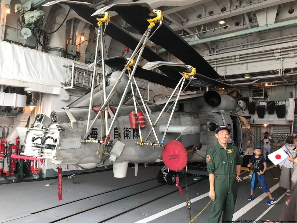 「むらさめ」を見学した後はお昼休憩をはさんで、午後から反対側の桟橋に見えていた「いずも」の見学です。こちらは「むらさめ」と違って、まず乗船からしてどこかのスタジアムの会場に入るようなスケールの大きい開口で、皆同時にどんどん入っていけます。入ったところは船内の格納庫のようで、ちょっとした学校のグランド並みの広さがあります。そこで、隊員の方によるロープの結び方や、制服、ヘリコプターの実機乗船などさまざまなイベントが同時開催されていました。