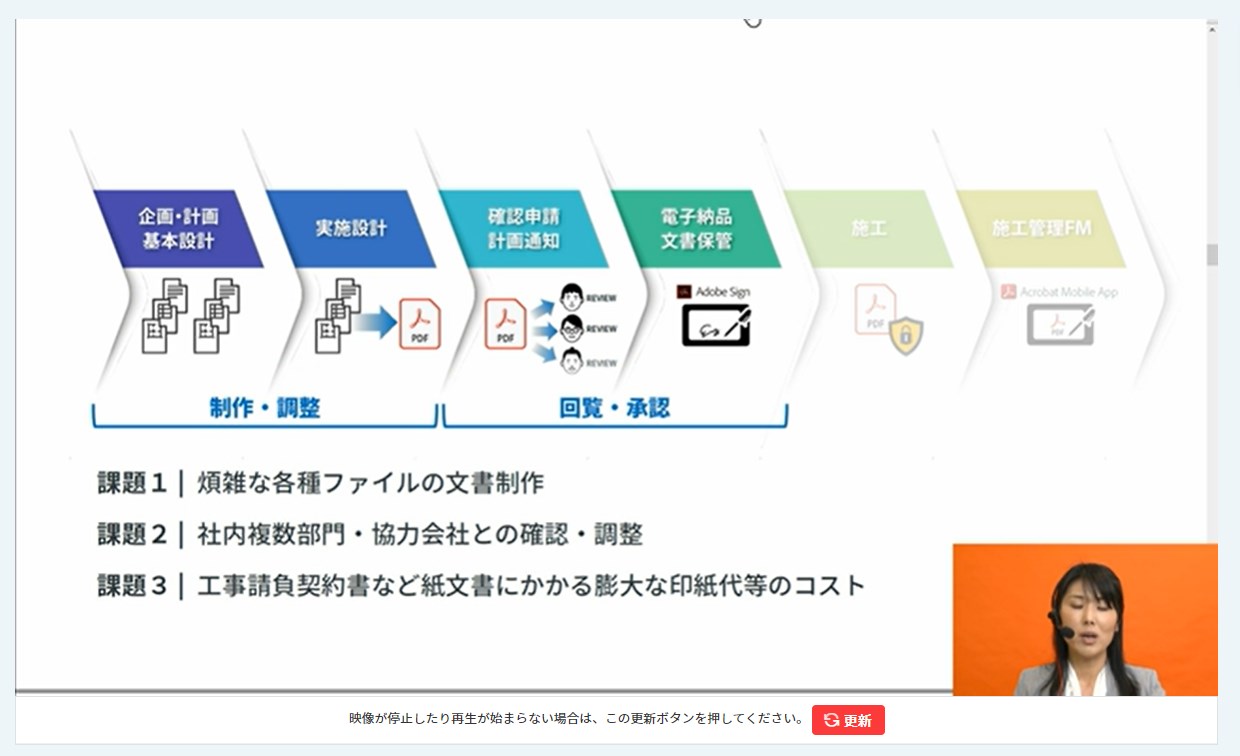 各種制限が緩和されつつある欧州ですが、まだまだEU域外への出入りは難しい状況です。そんなコロナ禍の中ですが、なんと日本で開催したセミナーに参加することが出来ました。もちろんWebセミナーで時差も考慮して日本時間の14時過ぎ(現地7時過ぎ)スタートのセミナーです。テーマは「デジタルx建設業 オンラインセミナー 今こそはじめる建設業界のデジタル化戦略 ~設計・施工図や受発注書の電子化であらゆる環境下で業務継続を~」という業界大手のAdobeが主催したもので、事前申し込み制でしたが特に制約もなく、前日までにメールで配布されたアドレスにアクセスすると、Web上で動画配信とチャット機能があるサイトで聴講するというものでした。