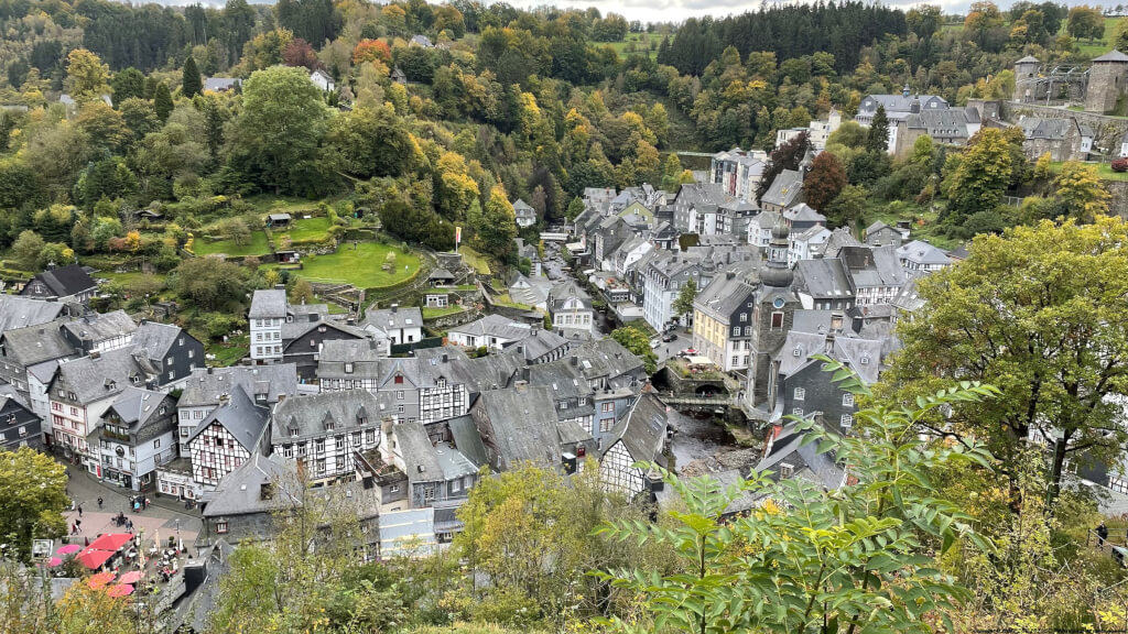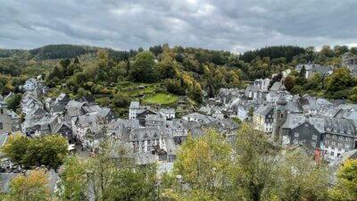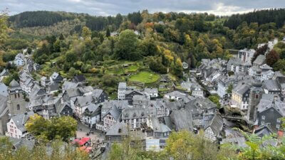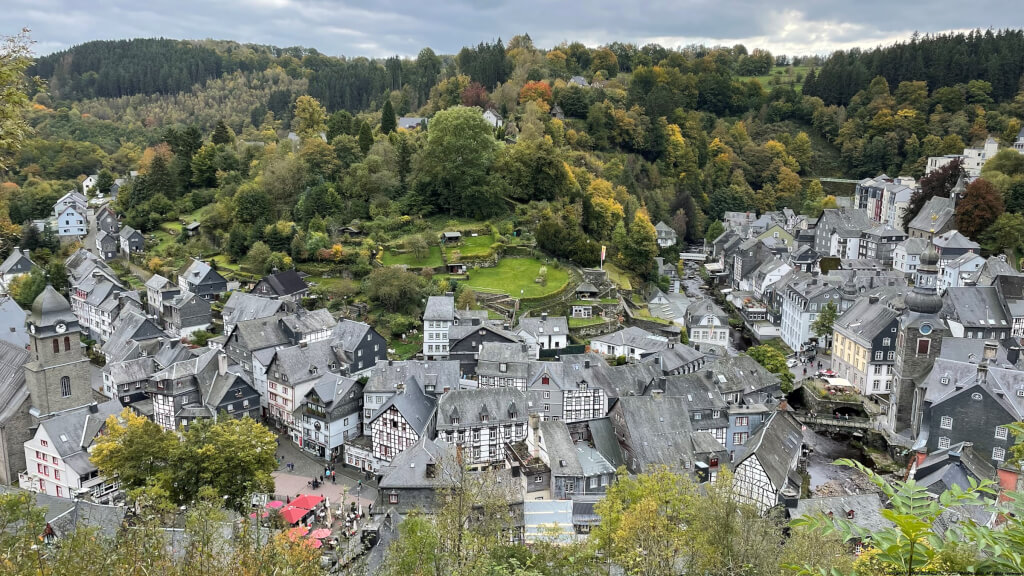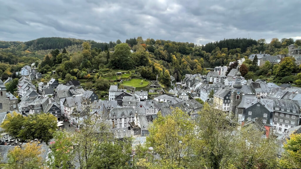 お昼の後に、リネックから見えた丘の上の遺跡?のような場所へ登ってみました。ここも10分もかからずに登れてしまいますが、見晴らしはよく小さいモンシャウの旧市街が一望出来てしまいます。上から見ると建物の屋根は明るいグレーで統一されていて、オレンジや赤っぽい色の屋根も多いヨーロッパの街並みの中ではちょっとシックな感じの色合いです。この村のサイトもあって、クリスマスマーケットの情報なども載っています。