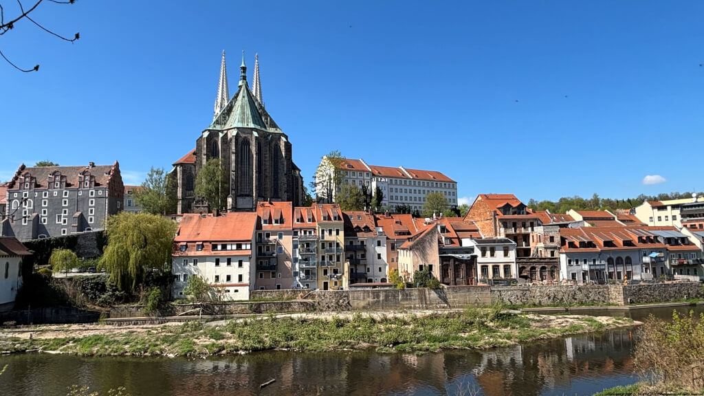 ドイツ国境の街と言っても実は国境の河川であるナイセ川を挟んだドイツ側お向かいの街であるゲルリッツとは、第二次世界大戦前までは一緒の街であったということで、小さな河を挟んでほぼ街としては一体化しています。実際に街を散策してポーランド側から徒歩で市街地橋を100mも歩くとそのままドイツ側に行くことができます。例によって何の検問もチェックもなく、短時間であればドイツ側の方に渡って観光するのも全く問題ない感じで、実際に我々もドキドキしながらもドイツ側に渡ってリネック広場などを小1時間ほど散策してみました。