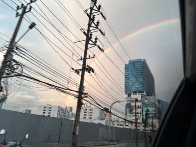 タイはちょうど今は雨季ということで、スコールのような雨も多く、どちらかというと全体的に湿っている感じの気候ですので、虹も結構な頻度で出現しているのかも知れません。まあヨーロッパと比べるとどうしても街中の背景は雑踏が多く、空も奇麗とは言い難いのですが、それでも虹が見れるとホッとする気持ちにはなります。