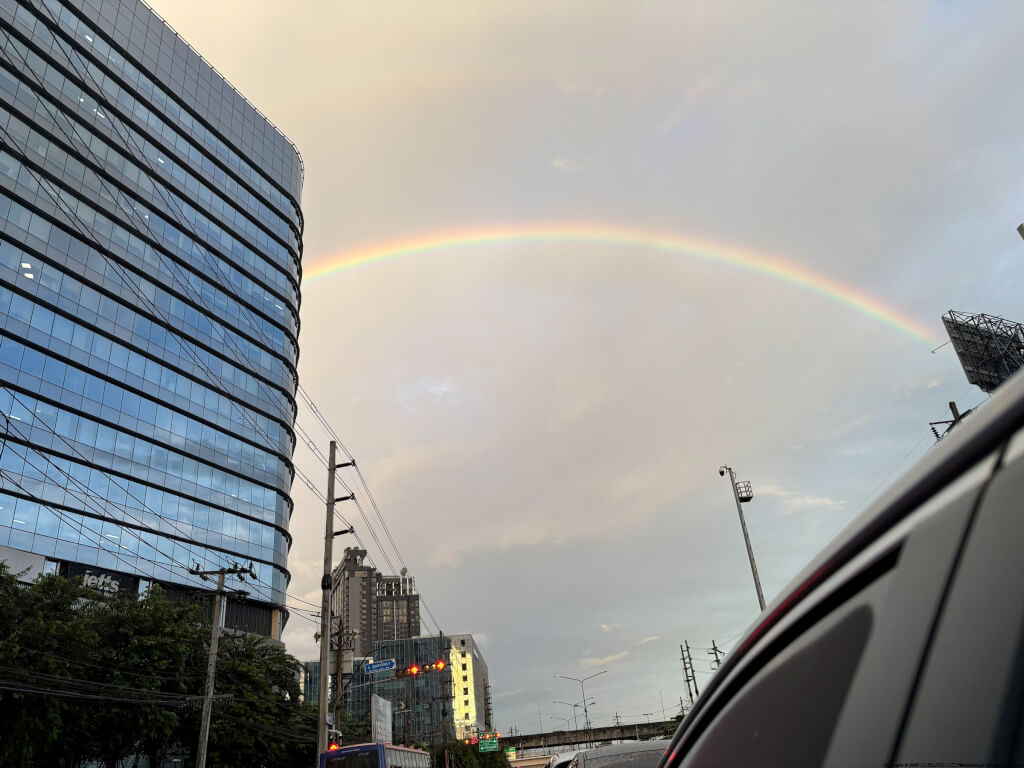 タイはちょうど今は雨季ということで、スコールのような雨も多く、どちらかというと全体的に湿っている感じの気候ですので、虹も結構な頻度で出現しているのかも知れません。まあヨーロッパと比べるとどうしても街中の背景は雑踏が多く、空も奇麗とは言い難いのですが、それでも虹が見れるとホッとする気持ちにはなります。