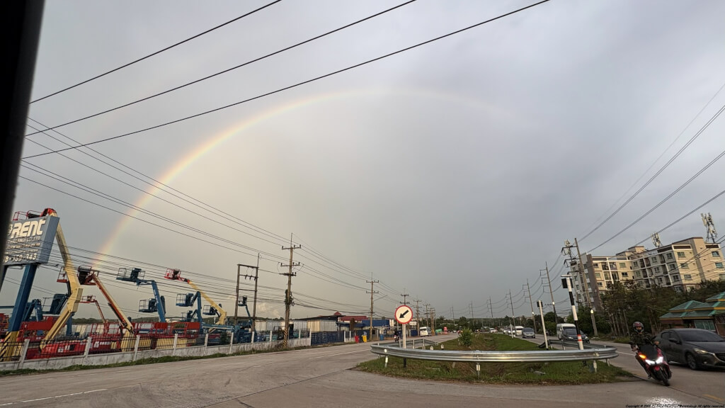 先の駐在地の欧州ポーランドのヴロツワフ市内ではかなり頻繁に虹を見ることができましたが(自宅からも何度も眺めましたし写真も撮れましたし)、アジアに戻ってタイではどうだろうかと思っていたところ、職場のラヨンの帰り道に立派な虹に遭遇することができました。