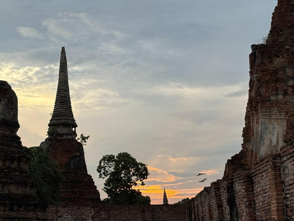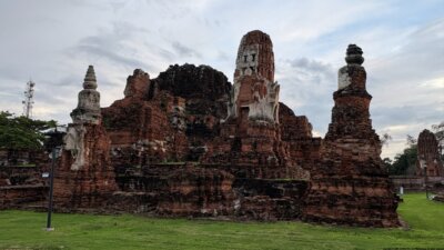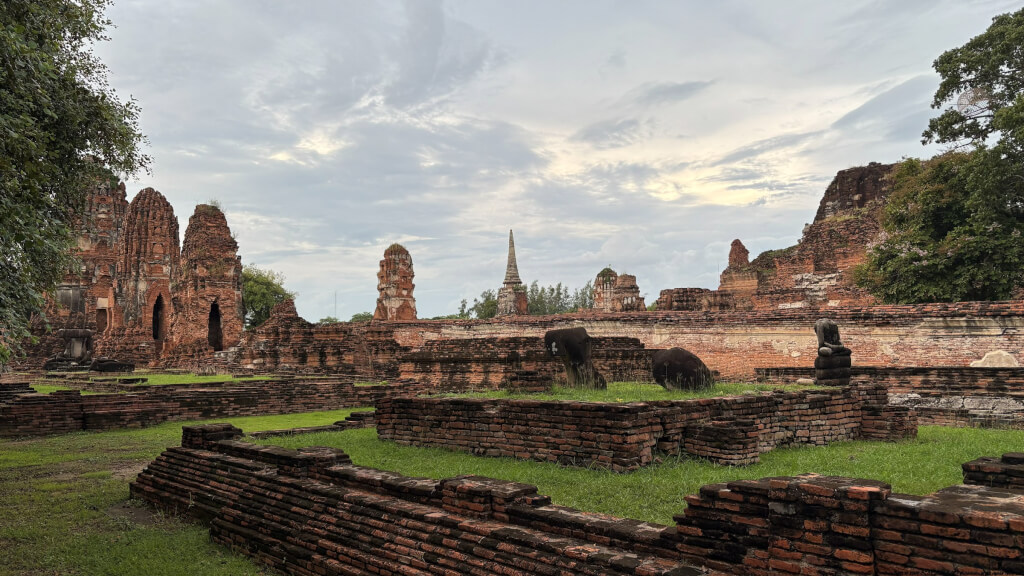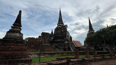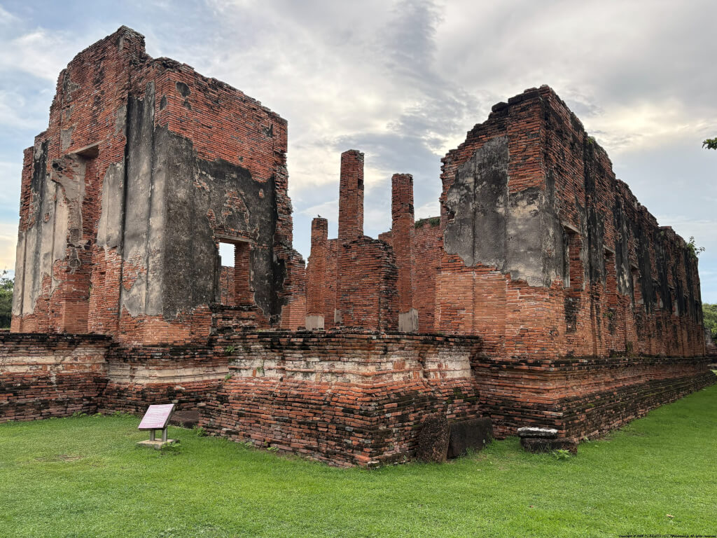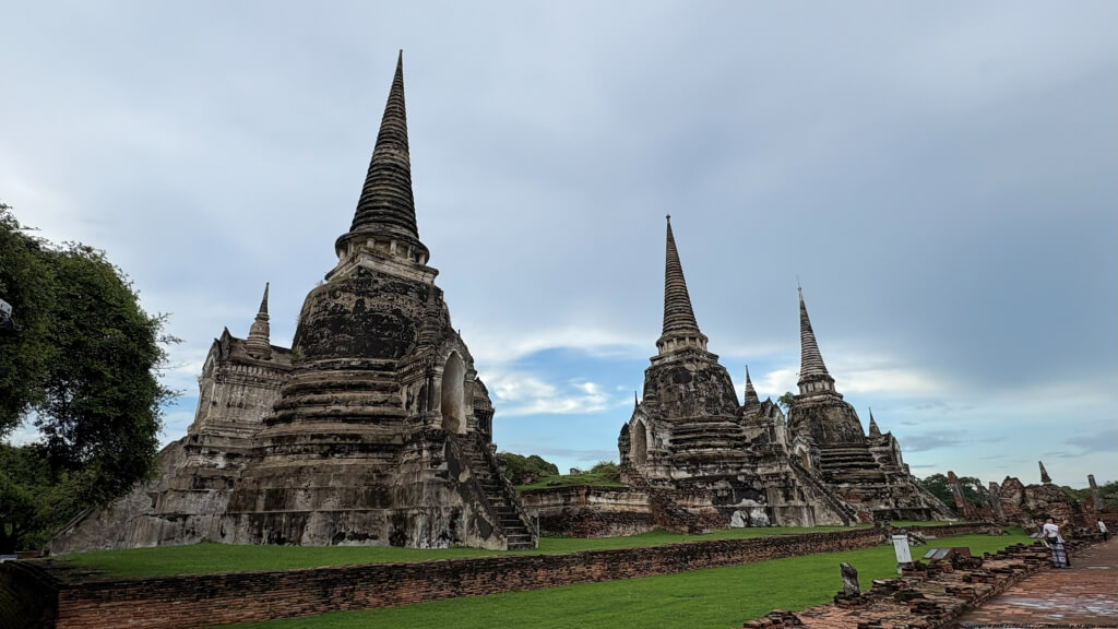 最初の遺跡は定番のワット プラ シー サンペットで中心にある3つの仏塔が存在感を放っています。こちらが遺跡公園の中心の場所となるので、恐らくは遺跡巡りのスタート場所としては定番なのかなと思います。連休初日で混雑しているかとも思いましたが、雨期でもありますし夕方でしたので、人影はどちらかというと少ない印象でした。