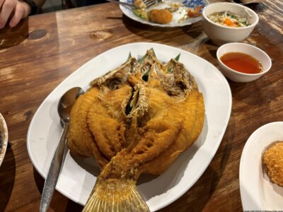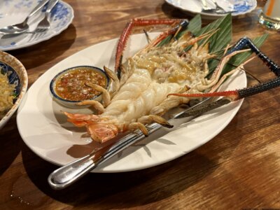 それでも夕方近くに訪れたワット プラ マハータートは、夕焼けを背景に奇麗な遺跡ではありました。その後は、川沿いにあるこれもアユタヤの定番ですが川海老料理を食べてみました。川海老料理を出してくれるお店は沢山あるようですが、無難にGoogleで評価の高そうだった「ペークルンガオ」というお店にしてみました。お昼は賑わっているような気配はありましたが、夕食時はガラガラで広い店内には2,3組といった感じでした。肝心の川海老料理は一匹700バーツと高めな感じでしたが、川海老のボイルの開きとミンチのリングフライ、白身魚のフライなどまあ無難なお味ではありました。