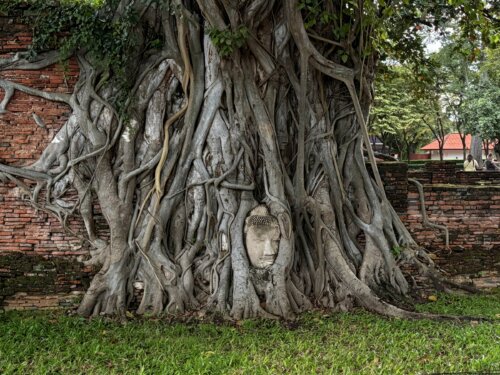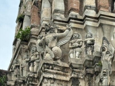 寝釈迦自体はやはり大きく、特大の足も相まって存在感があります。最近塗り直されたということで、くすんだ黄色の外観からは歴史は感じませんが、これはこれで良いのかなという感じです。ここは寝釈迦以外は特に見るところもありませんでしたので、グラブで遺跡中心部のワット ラーチャブーラナに戻り、そちらを見学してみました。初日の昨日の最後に見学したワット プラ マハータートの横にある遺跡ですが、こちらはレンガの外側の漆喰のガルーダ像やお釈迦様の彫り物が割と保存されている寺院ということで、他のほぼレンガしか残っていない寺院遺跡とは一風変わった外観となっています。