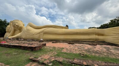 寝釈迦のあるワット ローカヤスタは無料で訪れることができ、確かここも20年前は自転車で回った記憶があり、その時は土漠の中にあったような記憶でしたが、今は何処の道も綺麗に舗装されて、寝釈迦の周りも芝生で整備されており、いたって綺麗な郊外の観光名所といったところです。もちろん、通りにはお土産屋と茶店もあります。