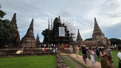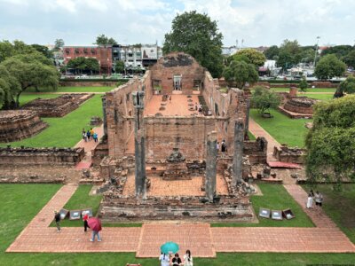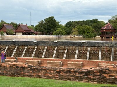 その後は今度はグラブに切り替えて、少し離れたワット・チャイワッタナーラームを見学に行きました。道中、市内を蛇行しているチャオプラヤー川を渡ったのですが、川向うは雨季で水が冠水しているようで、河の側の住宅街は溢れた水で下の階などは完全に水没してしまっている状態でした。お寺側の道も土嚢が積まれていて遺跡の敷地自体も脇のチャオプラヤー川の水位の方が明らかに高くなっており、仮設の防波堤?で堰き止めている感じでしたが、遺跡自体は観光客で賑わっており、敷地内では普通にイベントの用意などもされていて特に警戒感は全く感じない状態に驚いてしまいました。