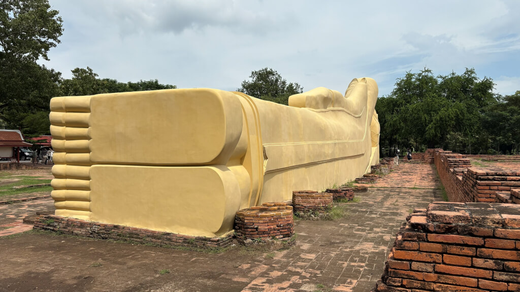 寝釈迦のあるワット ローカヤスタは無料で訪れることができ、確かここも20年前は自転車で回った記憶があり、その時は土漠の中にあったような記憶でしたが、今は何処の道も綺麗に舗装されて、寝釈迦の周りも芝生で整備されており、いたって綺麗な郊外の観光名所といったところです。もちろん、通りにはお土産屋と茶店もあります。