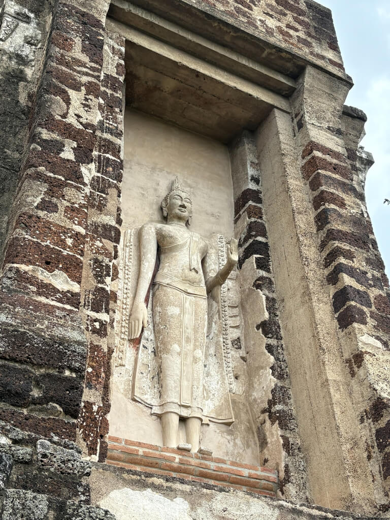 寝釈迦自体はやはり大きく、特大の足も相まって存在感があります。最近塗り直されたということで、くすんだ黄色の外観からは歴史は感じませんが、これはこれで良いのかなという感じです。ここは寝釈迦以外は特に見るところもありませんでしたので、グラブで遺跡中心部のワット ラーチャブーラナに戻り、そちらを見学してみました。初日の昨日の最後に見学したワット プラ マハータートの横にある遺跡ですが、こちらはレンガの外側の漆喰のガルーダ像やお釈迦様の彫り物が割と保存されている寺院ということで、他のほぼレンガしか残っていない寺院遺跡とは一風変わった外観となっています。
