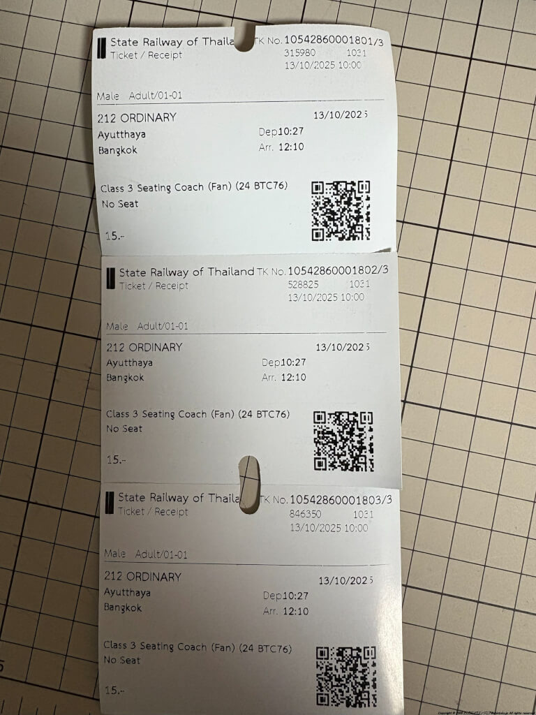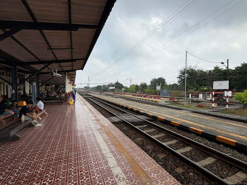 駅構内は特に何の変哲もないローカル路線の駅といった感じで、チケットも窓口で購入しましたが、驚いたのは駅のローカル度だけではなく、驚愕のチケットの値段です。たまたま一番早い電車がローカル路線のファン無し自由席というカテゴリだったというせいかも知れませんが、なんと一人15バーツという乗車券です!これでバンコクまで帰れてしまうのですから、一体いつからこの値段なのだろうという感じです。もしかしたら前回使った20年前から変わっていないのかも知れません。